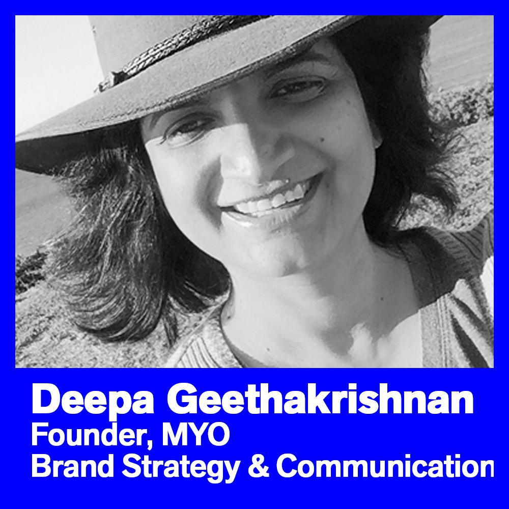 Deepa Geethakrishnan is an independent brand and communications consultant with leading agencies and clients like Marico, UL Singapore & HUL. She has over 25 years of experience across brand categories.